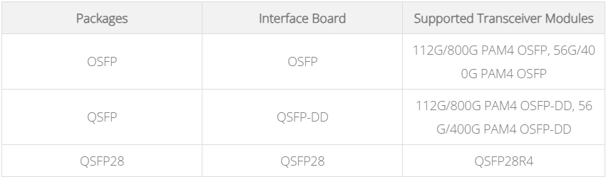 - Flexible configuration,support transceiver modules with different packages such as 800G OSFP,QSFP-DD,QSFP28