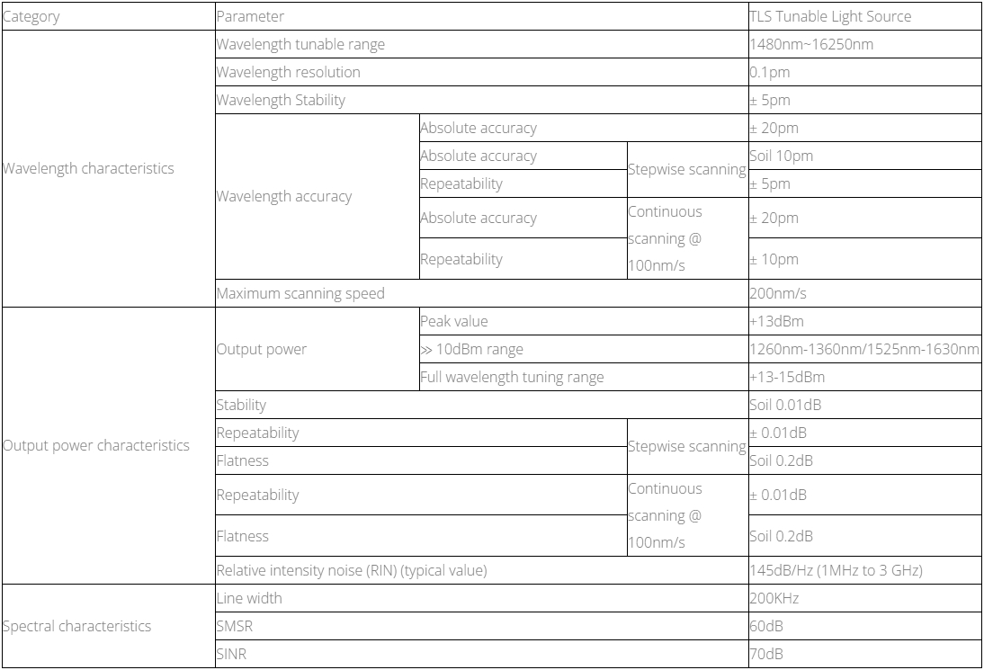 S+C+L band tunable light source – แหล่งกำเนิดแสงแบบปรับค่าได้เป็นเครื่องมือที่จำเป็นสำหรับการทดสอบที่เกี่ยวข้องกับความยาวคลื่นของอุปกรณ์แบบพาสซีฟและแอ็กทีฟในด้านการสื่อสารด้วยแสง ซึ่งสามารถปรับความยาวคลื่นที่เหมาะสมได้อย่างแม่นยำและรวดเร็วเพื่อตอบสนองความต้องการในการทดสอบ และสามารถชำระด้วยมิเตอร์วัดกำลังไฟฟ้าด้วยอัตราการสุ่มตัวอย่างที่สูง อีกทั้งรวบรวมเส้นโค้งความยาวคลื่นพลังงานของอุปกรณ์ได้อย่างมีประสิทธิภาพและทดสอบพารามิเตอร์ประสิทธิภาพที่ความยาวคลื่นต่าง ๆ