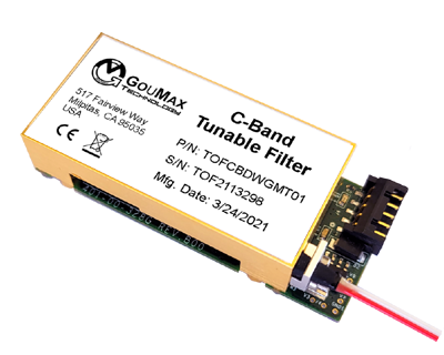 Tunable Optical Filters – ผลิตภัณฑ์ฟิลเตอร์ออปติกแบบปรับได้ (TOF) ของ GouMax ได้รับการออกแบบโดยใช้เทคโนโลยีไมโครออปติกส์และแบบปรับได้ที่เป็นกรรมสิทธิ์ของบริษัท เป็นอุปกรณ์ไฟเบอร์ออปติกควบคุมแรงดันไฟฟ้า 2 พอร์ตพร้อมอินเทอร์เฟซการสื่อสาร UART (RS232)/USB รูปร่างของแถบผ่านฟิลเตอร์อาจเป็นแบบเกาส์เซียนหรือแบบด้านบนแบน ตามที่แสดงในแผนผังในรูปที่ 1 ด้านล่าง เมื่อช่อง DWDM หลายช่องถูกส่งไปที่พอร์ตอินพุต ฟิลเตอร์แบบปรับได้จะเลือกช่องเป้าหมายหนึ่งช่องไปที่พอร์ตเอาต์พุตและบล็อกช่องอื่นๆ ทั้งหมด หากอินพุตเป็นสเปกตรัมแบนด์กว้าง ฟิลเตอร์แบบปรับได้จะเลือกแถบเป้าหมายสำหรับเอาต์พุตและปฏิเสธแถบสเปกตรัมที่เหลือ
